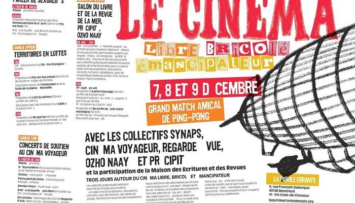 Trois jours autour du cinéma libre, bricolé et émancipateur à la Parole Errante / Salon du livre et des revues de la MER. « Grand match amical de ping-pong » les 7, 8 et 9 décembre avec les collectifs Synaps, Cinéma Voyageur, Regarde à Vue, Ozho Naayé et Précipité et la participation de la Maison des Ecritures … Lire la suite de Trois jours autour du cinéma libre, bricolé et émancipateur